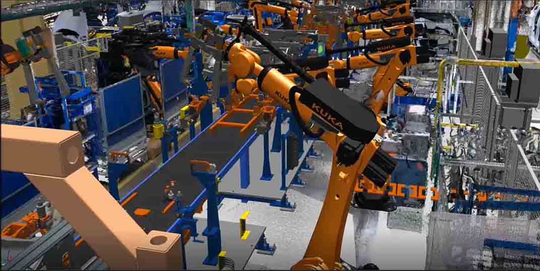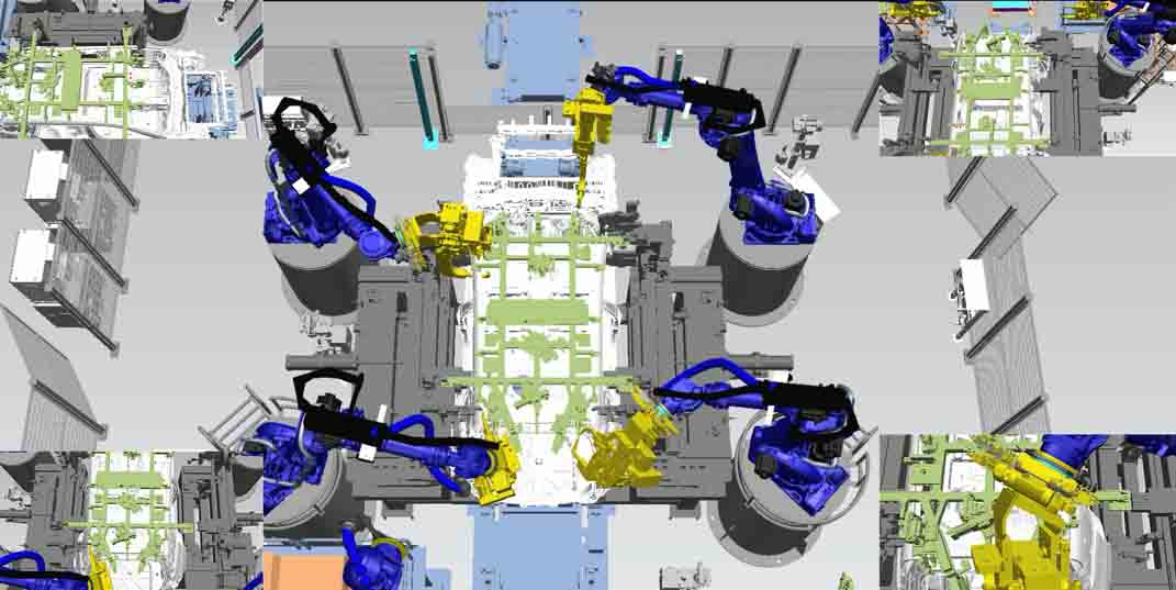 某焊裝車間,利用機(jī)器人仿真驗(yàn)證了激光焊,點(diǎn)焊,弧焊等工藝的合理性。調(diào)整焊接順序及位移,優(yōu)化機(jī)器人軌跡和干涉區(qū),利用離線編程等方式優(yōu)化了現(xiàn)場節(jié)拍平衡,提高了設(shè)備效率。